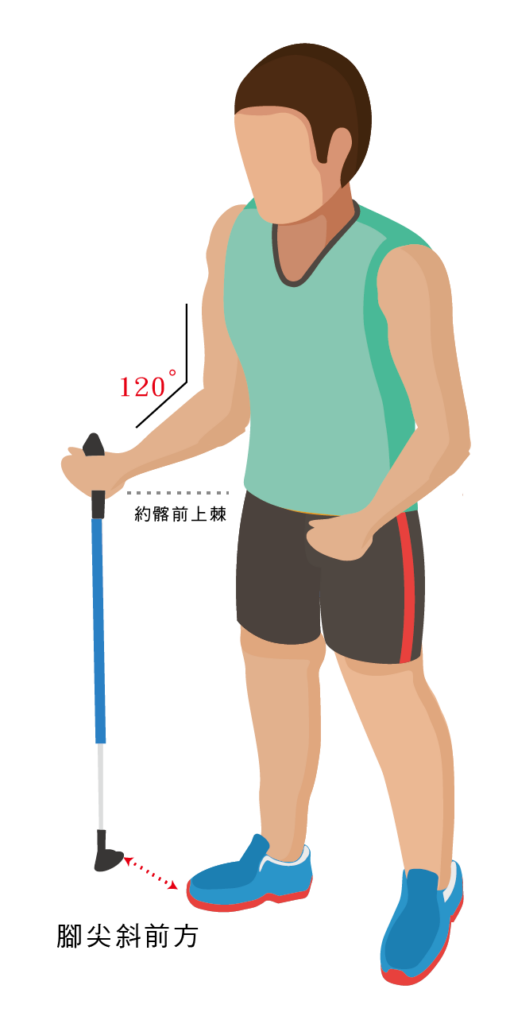 (二)初學、步幅小或站立(腳步)不穩定者,健走杖調整長度「較短」。手握健走杖握把高度約在髂前上棘高度(手肘角度約120度)