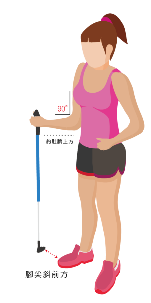 (一)將健走杖拉長,手握健走杖握把,手肘貼於腰際,健走杖直立,杖尖約至於腳掌外側前方(小手臂長位置)。